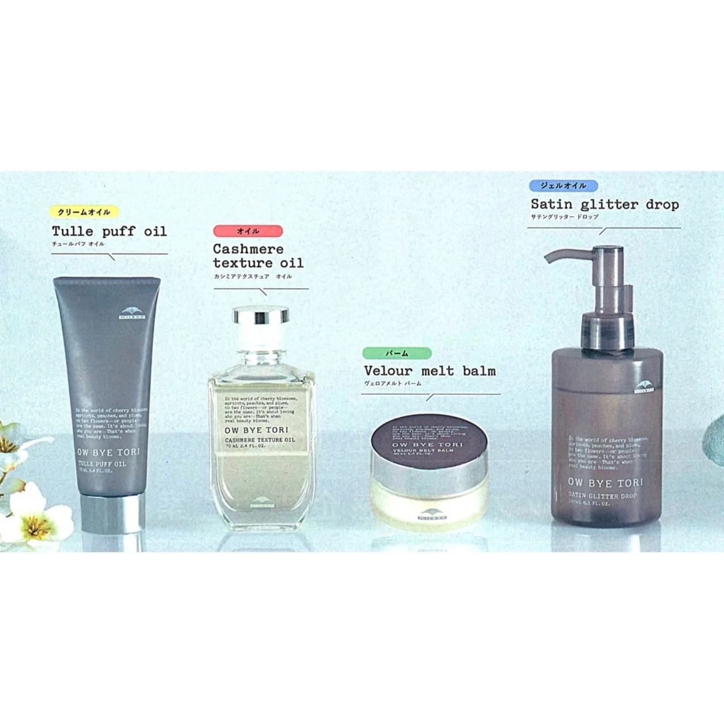 | 特徴 | ミルボンから新しく オーバイトーリは思い描いた髪の動きと、ツヤめきを与えるスタイリングシリーズです! シリーズは4アイテム! 〈チュールパフオイル〉 〈サテングリッター ドロップ/ジェルオイル〉 〈カシミアテクスチュア オイル〉 ヘアケア成分配合でデザインを楽しむ日中の時間を髪のケアタイムに😍 自分という花に存分に愛を。 ⚠️現在ネットショップ及び量販店、ドラッグストアにおいて、不正転売が発生しております。